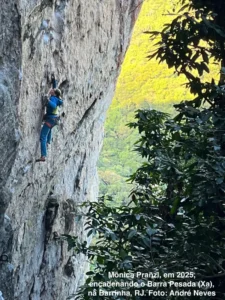Em 2025, aos 54 anos de idade, Mônica Pranzl encadenou (guiando) a linha Barra Pesada (Xa), na Barrinha, RJ. Para quem não está atento à história da escalada brasileira, Mônica é uma das escaladoras mais importantes. Mesmo trabalhando e com um casal de filhos, ela está ativa há quase 40 anos. Desde quando começou a escalar ela se tornou referência, inclusive para vários dos melhores escaladores (em suas épocas). Todavia, não é apenas por isso que ela merece ser premiada e reverenciada, seu histórico conta muito.